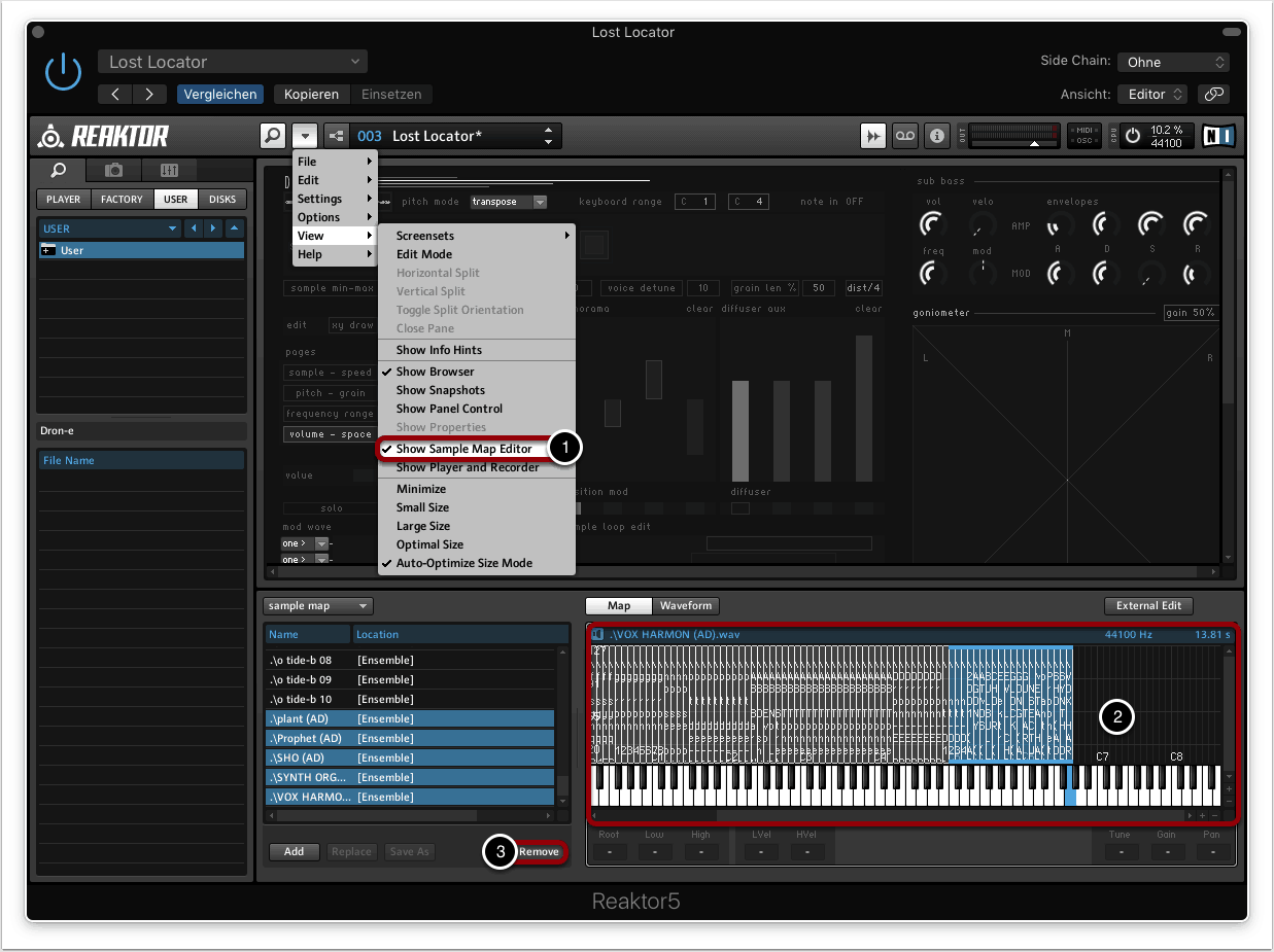 Um eigene Samples importieren zu können, müssen wir zunächst den Sample-Map-Editor von Reaktor öffnen. Diese Option finden wir über “View” -> “Show Sample Map Editor” (1).