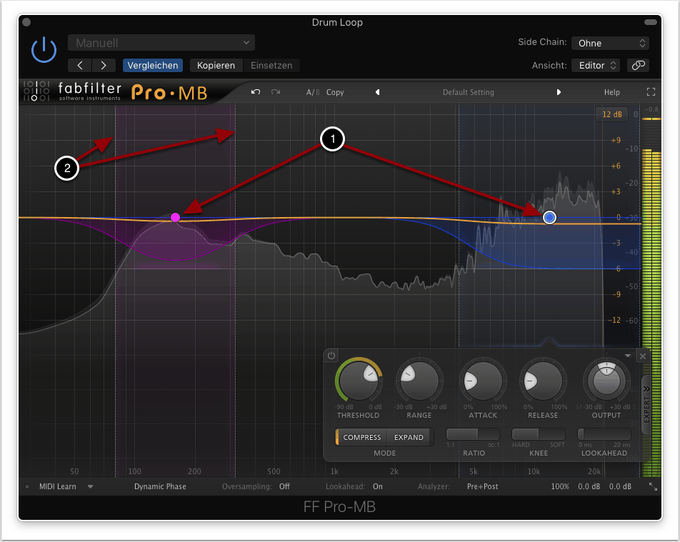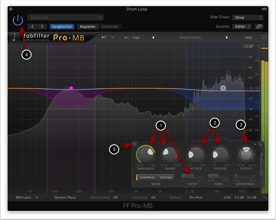 Mit “Threshold”, “Range” und “Ratio” kann die Stärke der Komprimierung pro Band festgelegt werden (1).