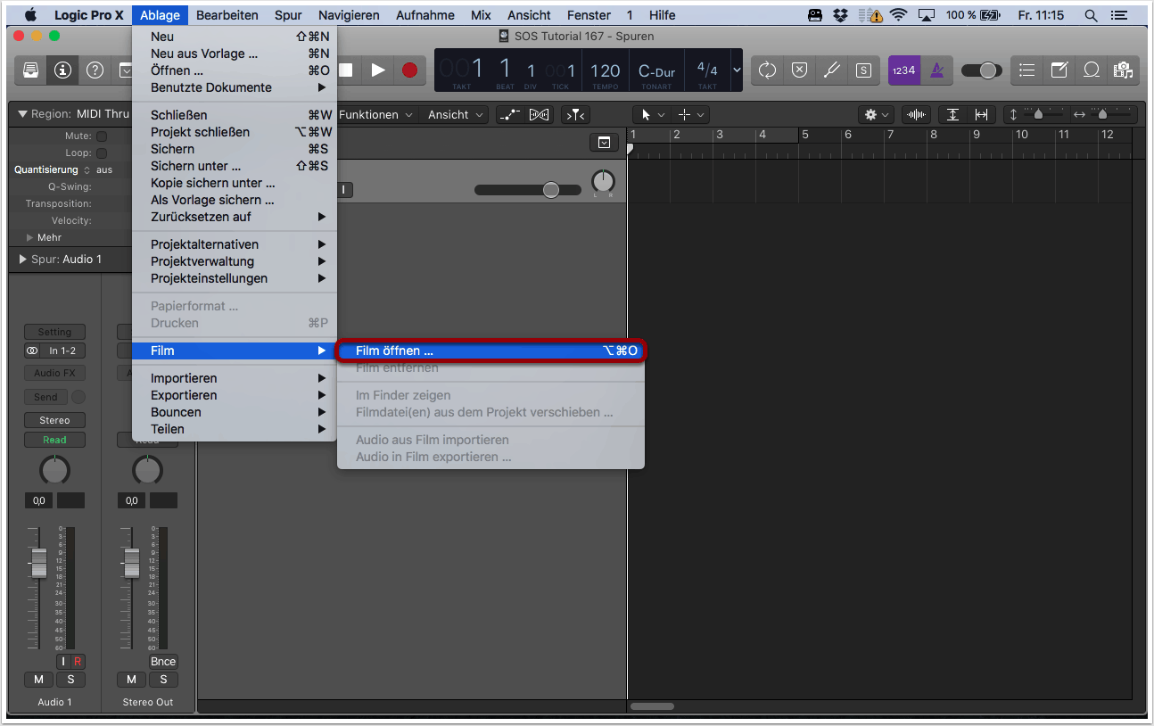 Um ein Video zu importieren, rufen wir über “Ablage” -> “Film” den Befehl “Film öffnen” auf. Alternativ können wir hierzu auch den Shortcut alt+cmd+o verwenden oder das Video einfach per Drag&Drop auf eine freie Audiospur ziehen.