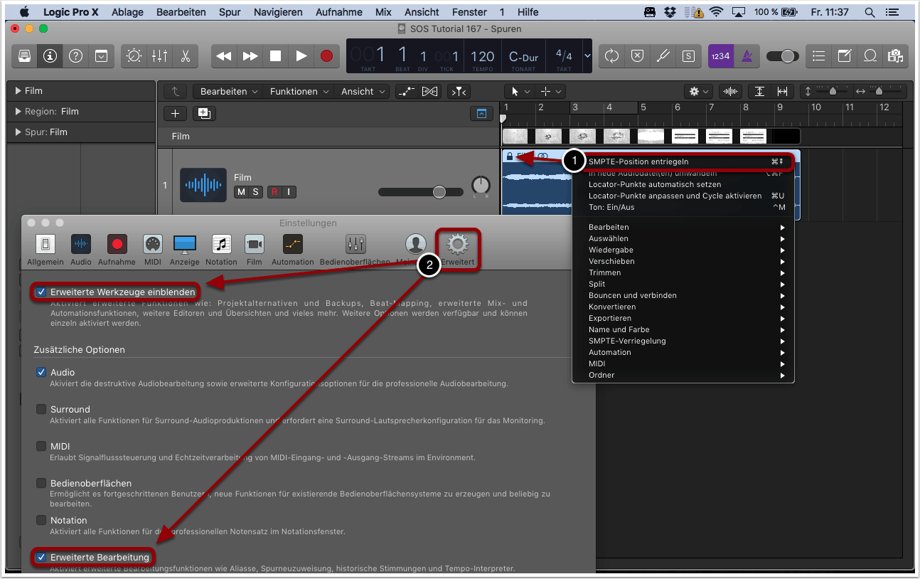 Wichtig: Damit dieser Befehl verfügbar ist, müssen die Optionen “Erweiterte Werkzeuge einblenden” und “Erweiterte Bearbeitung” in den Einstellungen von Logic unter der Rubrik “Erweitert” aktiviert sein (2)!