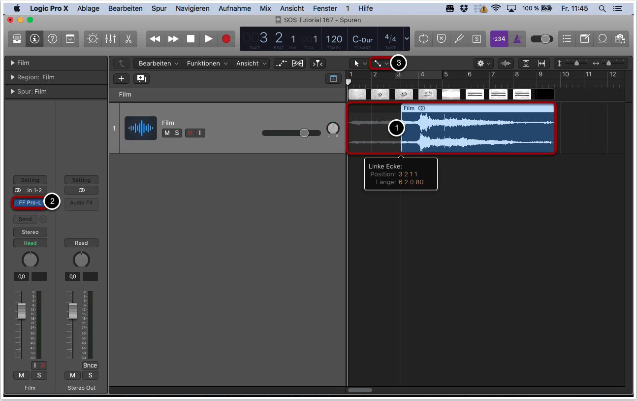 Auch Fades können an der Audiospur mit Hilfe des Fade-Tools erstellt werden (3).
