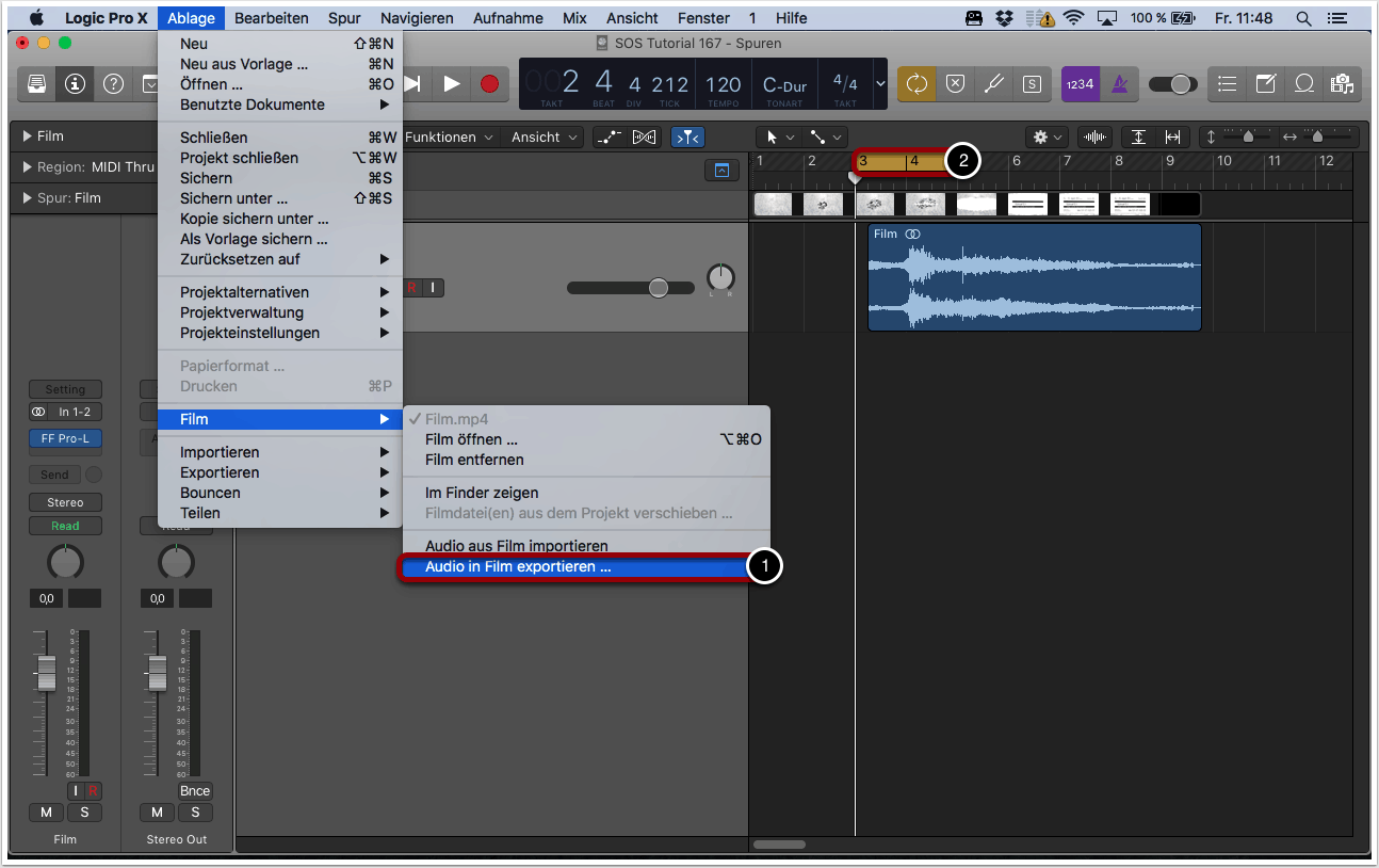 Um den kompletten Film mit der bearbeiteten Tonspur zu exportieren, begeben wir uns zum Menüpunkt “Ablage” -> “Film” und wählen die Option “Audio in Film exportieren” aus (1).