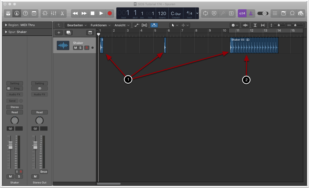 Wir erstellen eine neue Session in Logic Pro und importieren eine Reihe von Percussion Sounds in eine freie Audiospur (1).