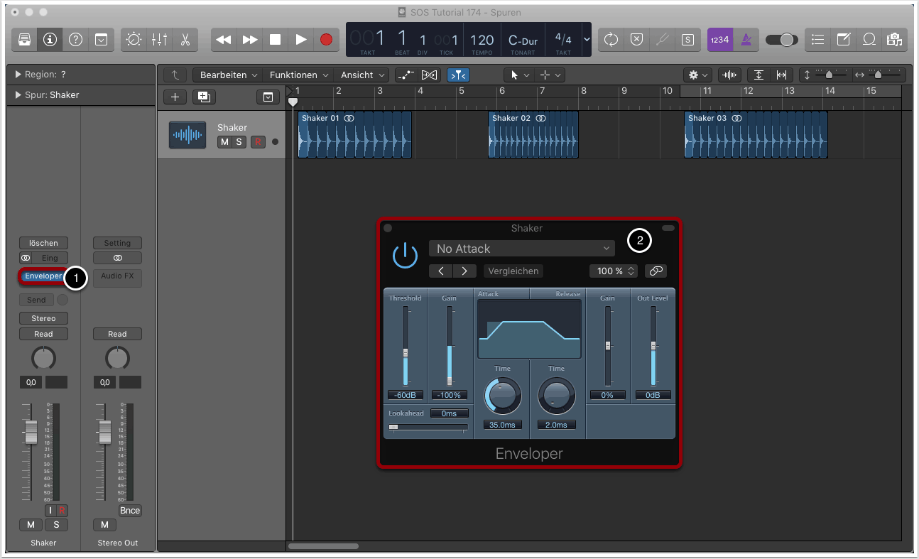 Mit dem Tool wollen wir die Attack Time ein wenig reduzieren, so dass die Sleigh Bells später schön soft klingen. Hierzu übertragen wir die Settings aus der Abbildung. Je nach Sample können die Werte für Threshold, Gain und Time angepasst werden (2).