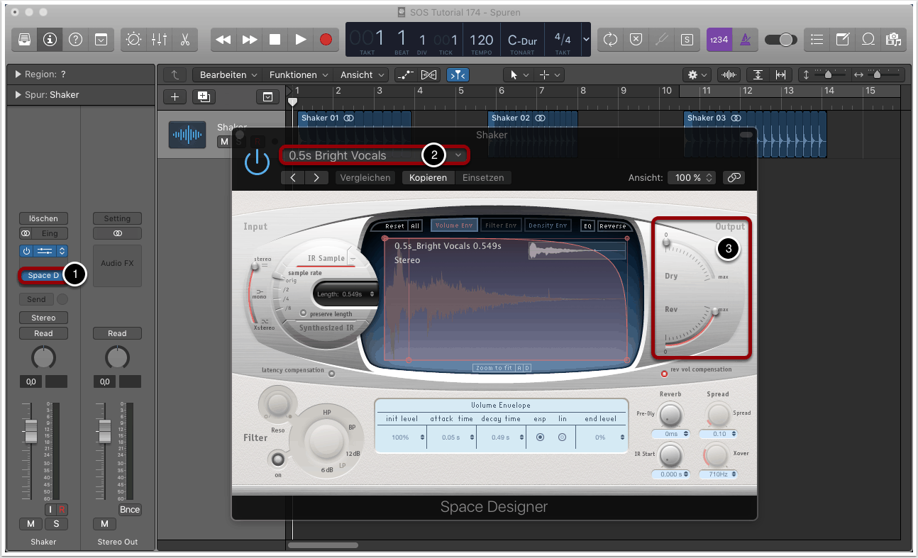Wir drehen den Wet-Regler komplett auf und den Dry-Regler komplett nach unten. Auch diese Settings können je nach gewünschtem Reverb-Anteil angepasst werden (3).