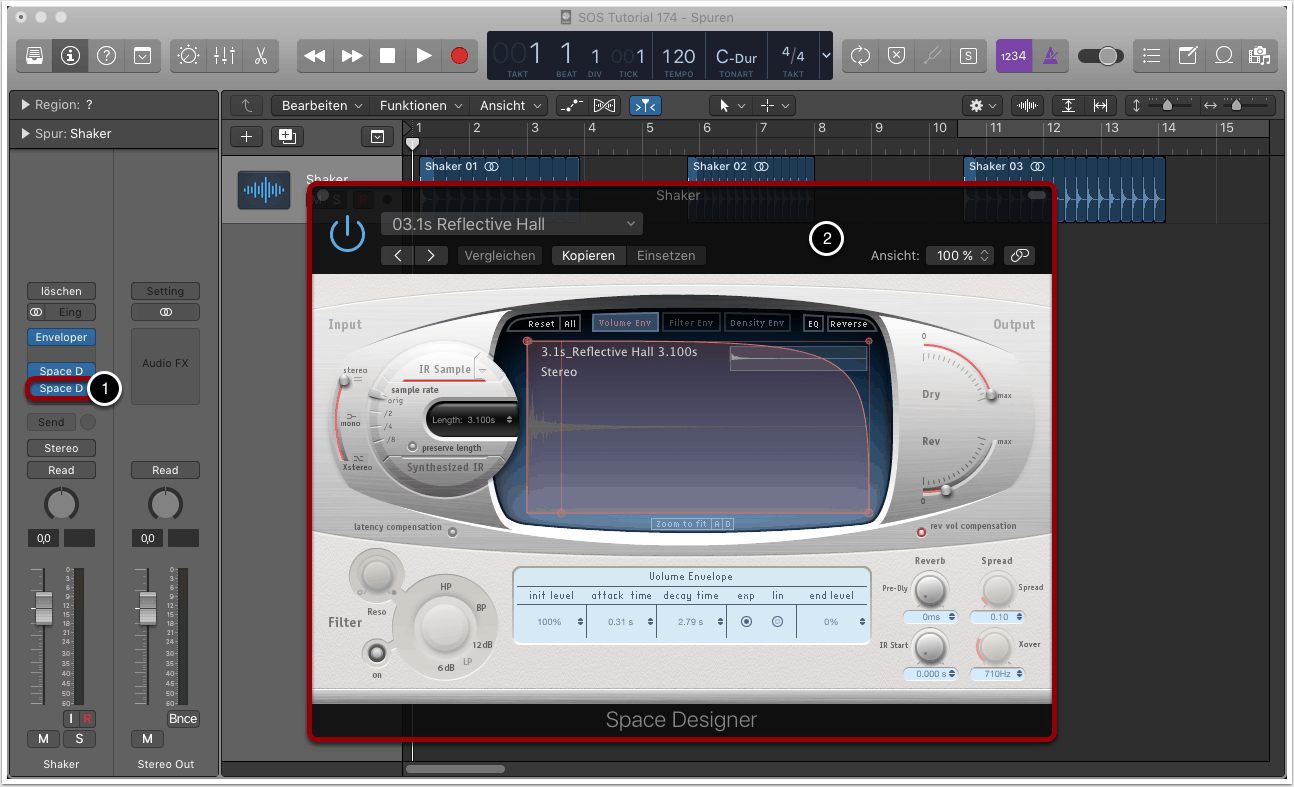 Als zweiten Effekt wählen wir Space Designer aus der Kategorie “Reverb” aus (1).