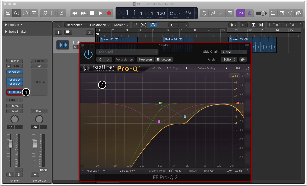 Abschließend wollen wir den Klang unserer Sleigh Bells mit Hilfe eines Equalizers anpassen (1).