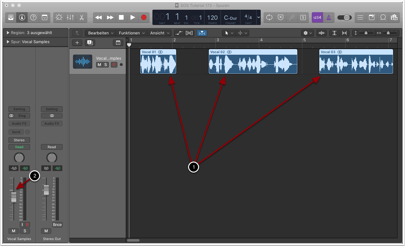 Wir erstellen eine neue Session in Logic Pro und importieren die Vocal Sounds, die wir gerne processen wollen, in eine freie Audiospur (1).