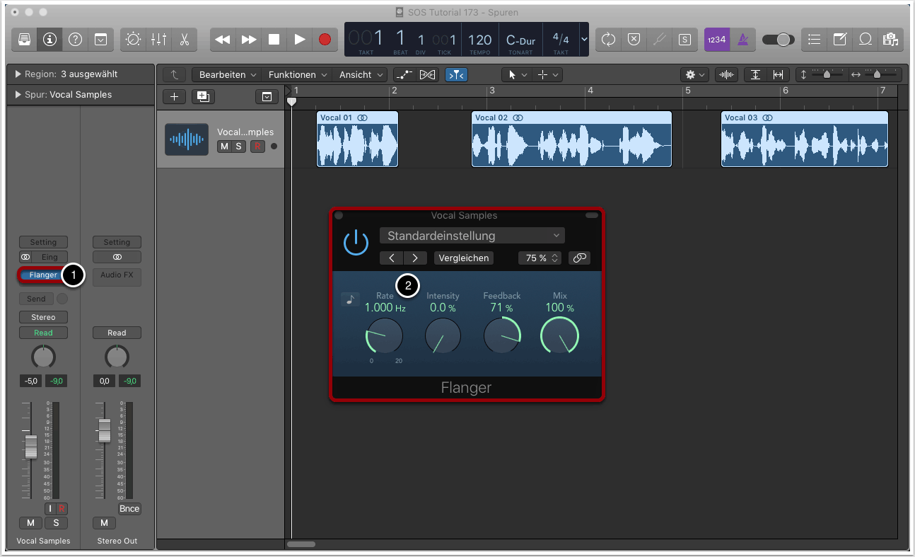 Als ersten Effekt wählen wir “Flanger” aus dem Audio-FX-Menü aus (1).