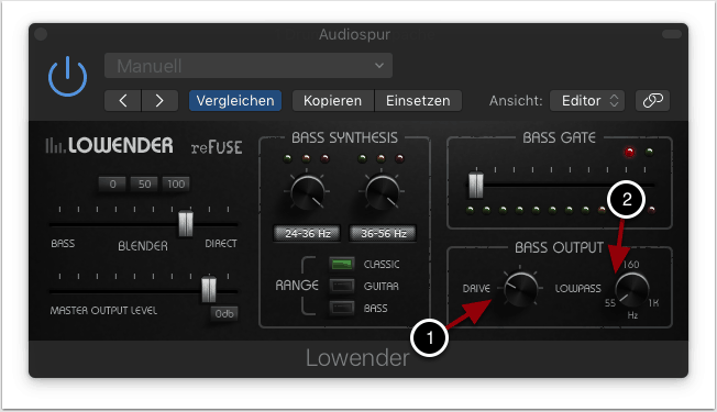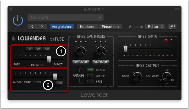 Mit dem Blender kann das Verhältnis zwischen Direktsignal (Dry-Signal) und Bass (Wet-Signal) festgelegt werden. Hierzu stehen auch drei Voreinstellungen zur Verfügung, mit 0% Direktsignal, 50% Dry/Wet und 100% Direktsignal (1).