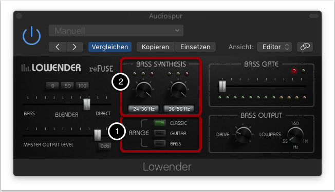 Mit dem Range-Selector kann einer von drei Bass-Typen ausgewählt werden. Diese unterscheiden sich hinsichtlich Klangcharakter und Frequenzbereich (1).