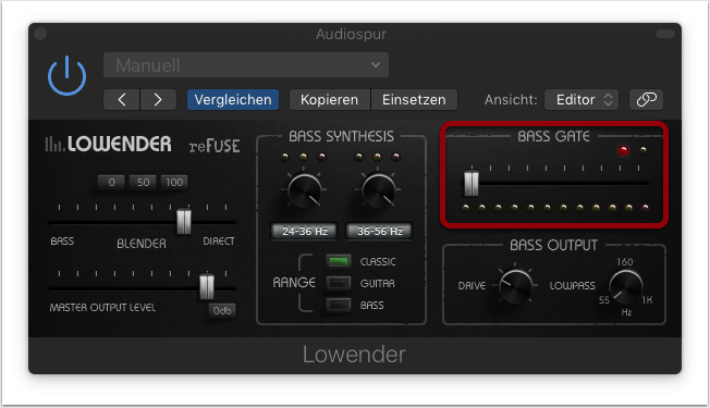 Das Bass-Gate ist insbesondere beim Processing von Drums nützlich. Es kann damit ein (abstrakter) Threshold festgelegt werden, so dass nur subharmonische Teiltöne hörbar sind, die oberhalb dieses Thresholds liegen. Drum Breaks erscheinen dadurch knackiger und das Klangbild wirkt aufgeräumter.