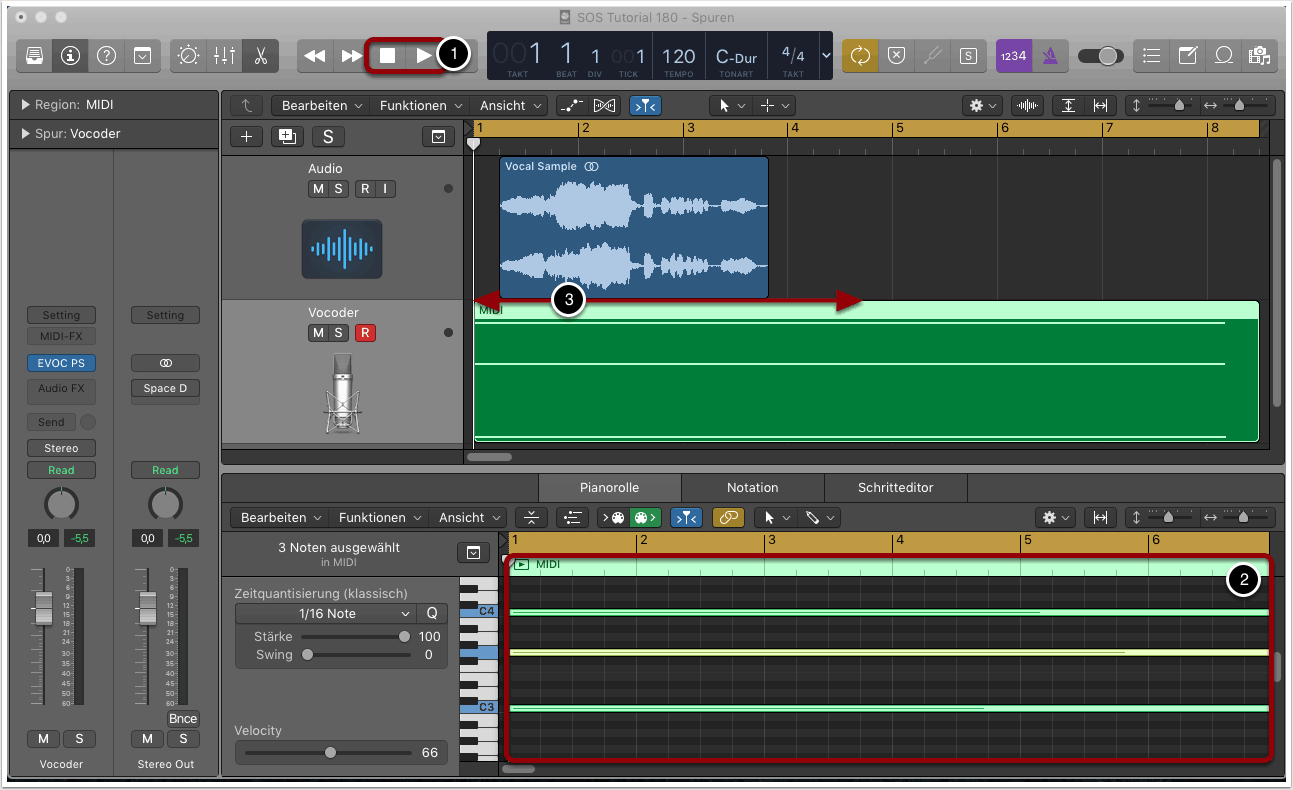 Sind wir zufrieden mit dem Ergebnis, kann die finale Version als neue Audiodatei gebounced werden. Die MIDI-Region sollte vor dem Einsatz des Vocal Samples beginnen und über die Länge der Audioregion hinaus gehen (3).