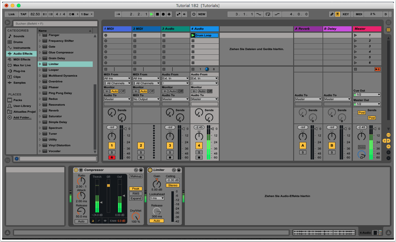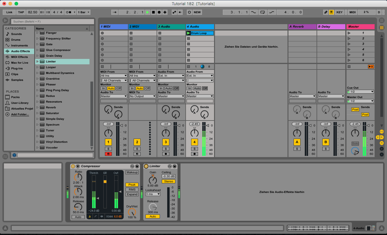 Wir benötigen hierzu einen beliebigen Limiter, den wir in unmittelbar hinter den Kompressor ziehen (1).