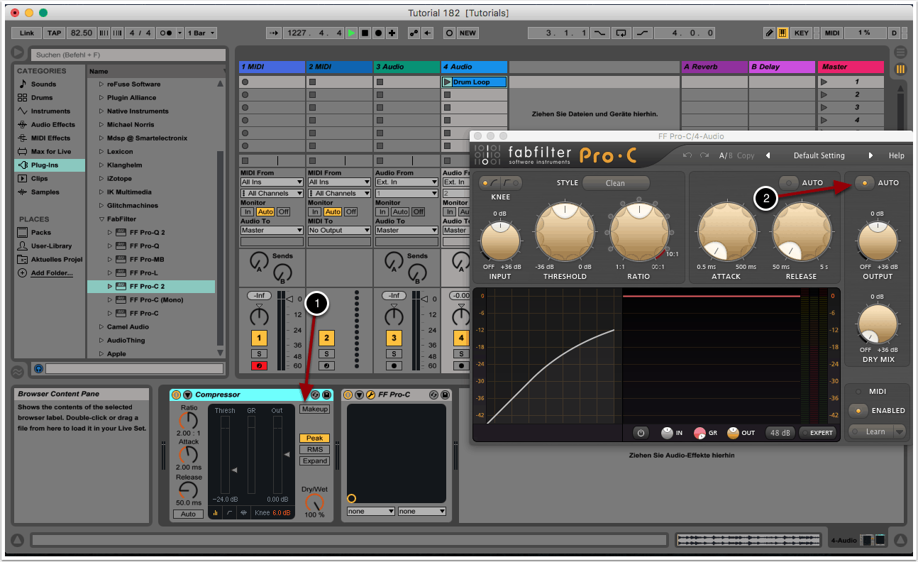 Beim Pro-C von FabFilter verbirgt sich der Makeup Gain hinter dem „Auto Button“ (2).