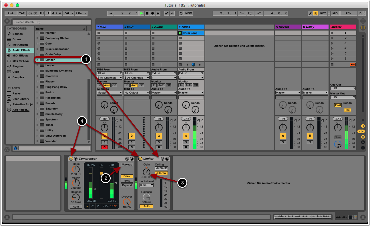 Nachdem wir geeignete Settings für den Kompressor gefunden haben, wollen wir die geringer gewordene Lautstärke mit Hilfe des Gains des Limiters manuell kompensieren. Der Limiter funktioniert dabei lediglich als einfacher Gain und sollte selbst nicht ausschlagen (3).