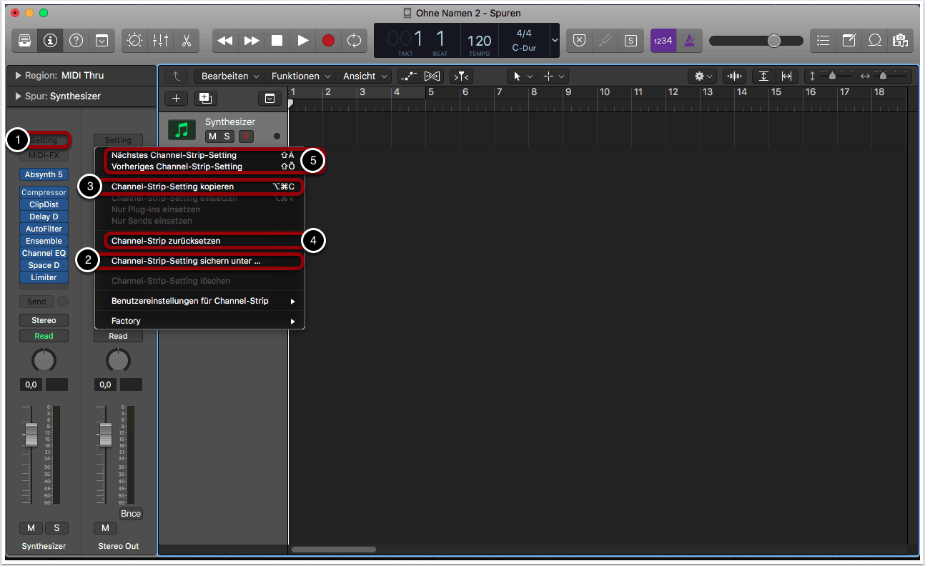 Über „Channel-Strip zurücksetzen“ entfernen wir alle Effekte aus der Spur (4).