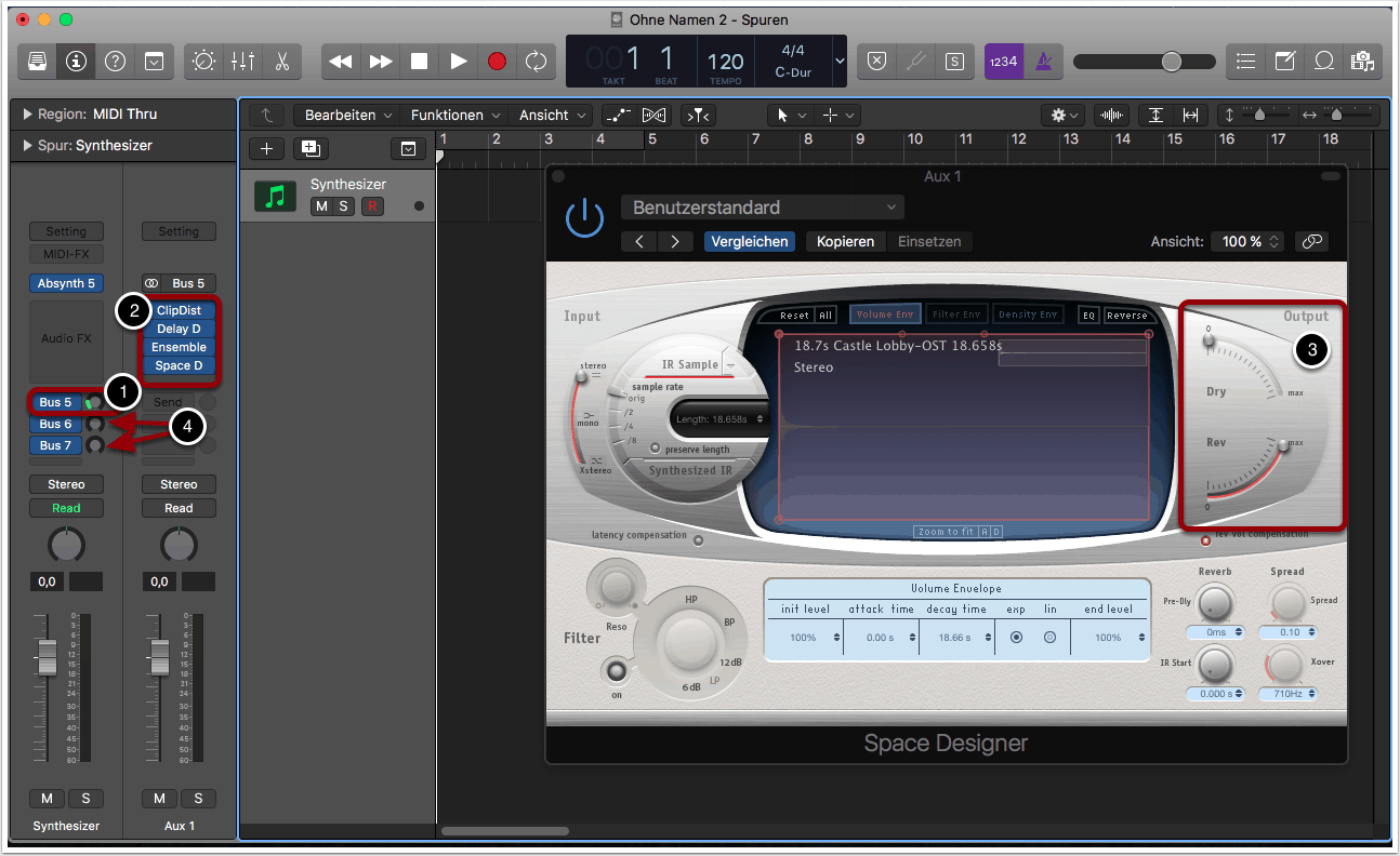 Für alternatives Processing können wir weitere Send-Bus-Ketten erstellen. Um verschiedene Klangbearbeitungen durch unterschiedliche Effektketten zu testen, können wir jetzt einfach die Send-Anteile erhöhen oder minimieren (4).