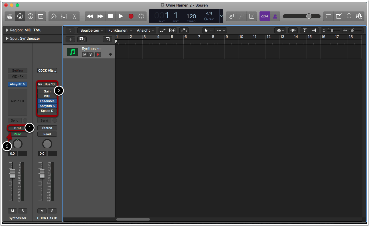 Wir wählen einen beliebigen, freien Bus als Output der Spur aus (1).
