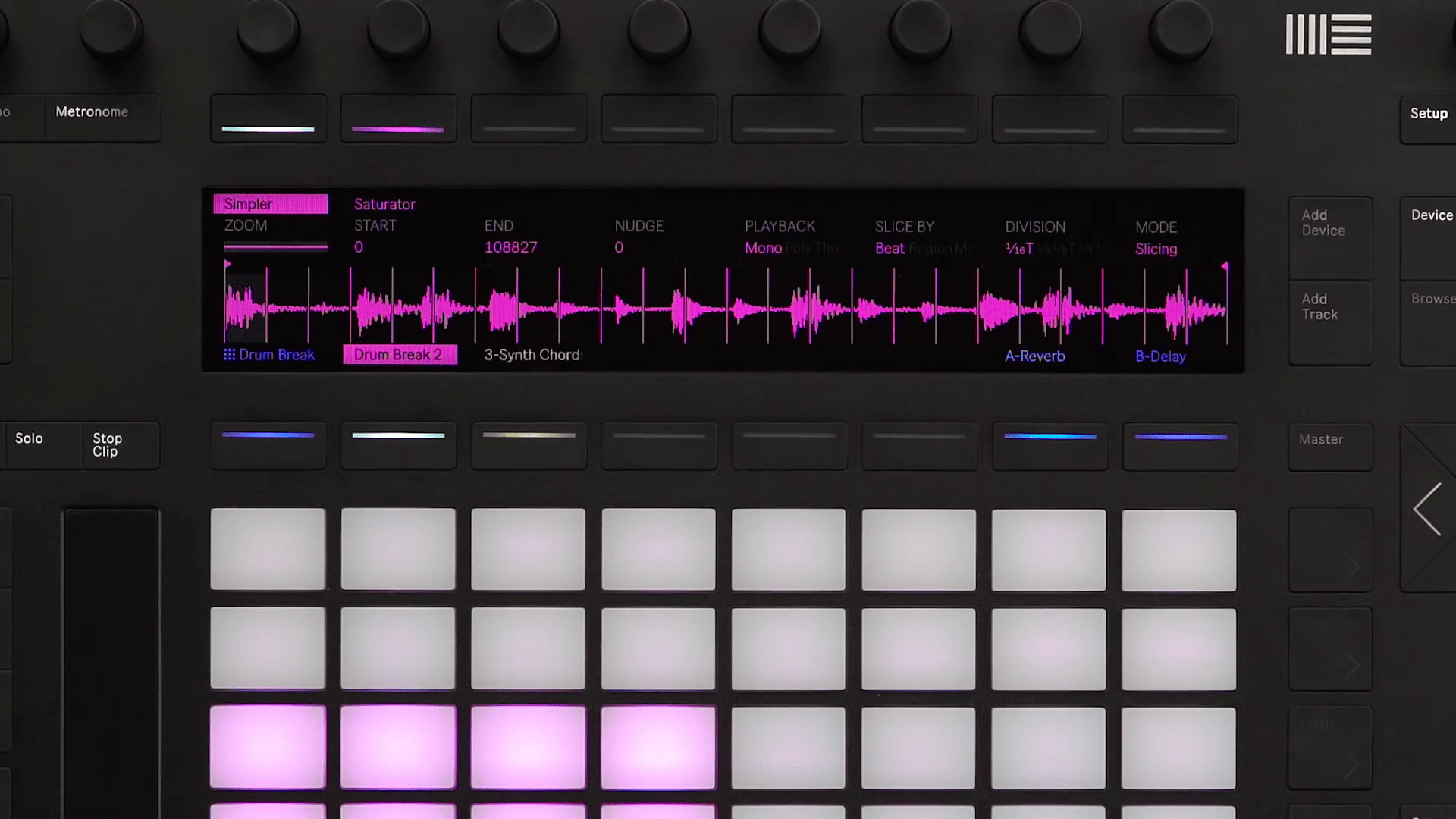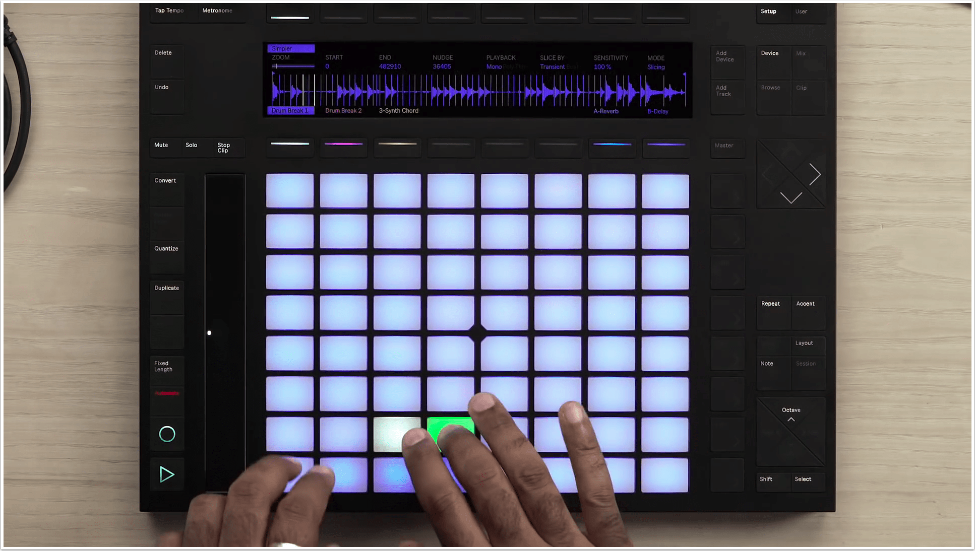 Auch Live-Instrumente, -Effekte und Samples sowie VST-/AU-Plug-ins können umittelbar über Push angesteuert werden. Eigene Sounds können schnell und einfach gesucht, vorgehört und geladen werden. Das Farbdisplay zeigt die Sample-, Instrument- oder Effektparameter und ermöglicht intuitives, flexibles Arbeiten mit berührungsempfindlichen Endlos-Drehreglern.