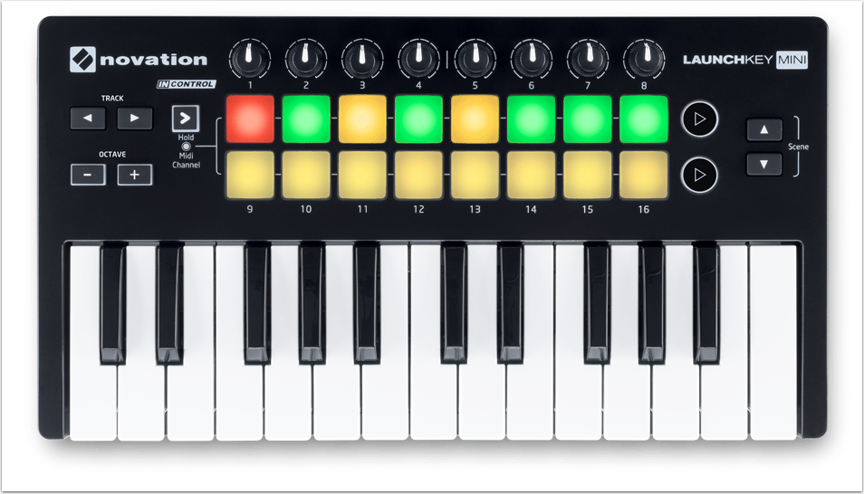 Das Launchkey Mini ist mit 25 Mini-Tasten im Synth-Style ausgestattet und verfügt über 8 Drehregler sowie 16 anschlagempfindlichen Mehrfarb-Pads. Dank USB-Bus-Power ist ein Netzteil überflüssig, wodurch sich der Controller besonders gut für Live-Performances mit wenig Platz eignet.