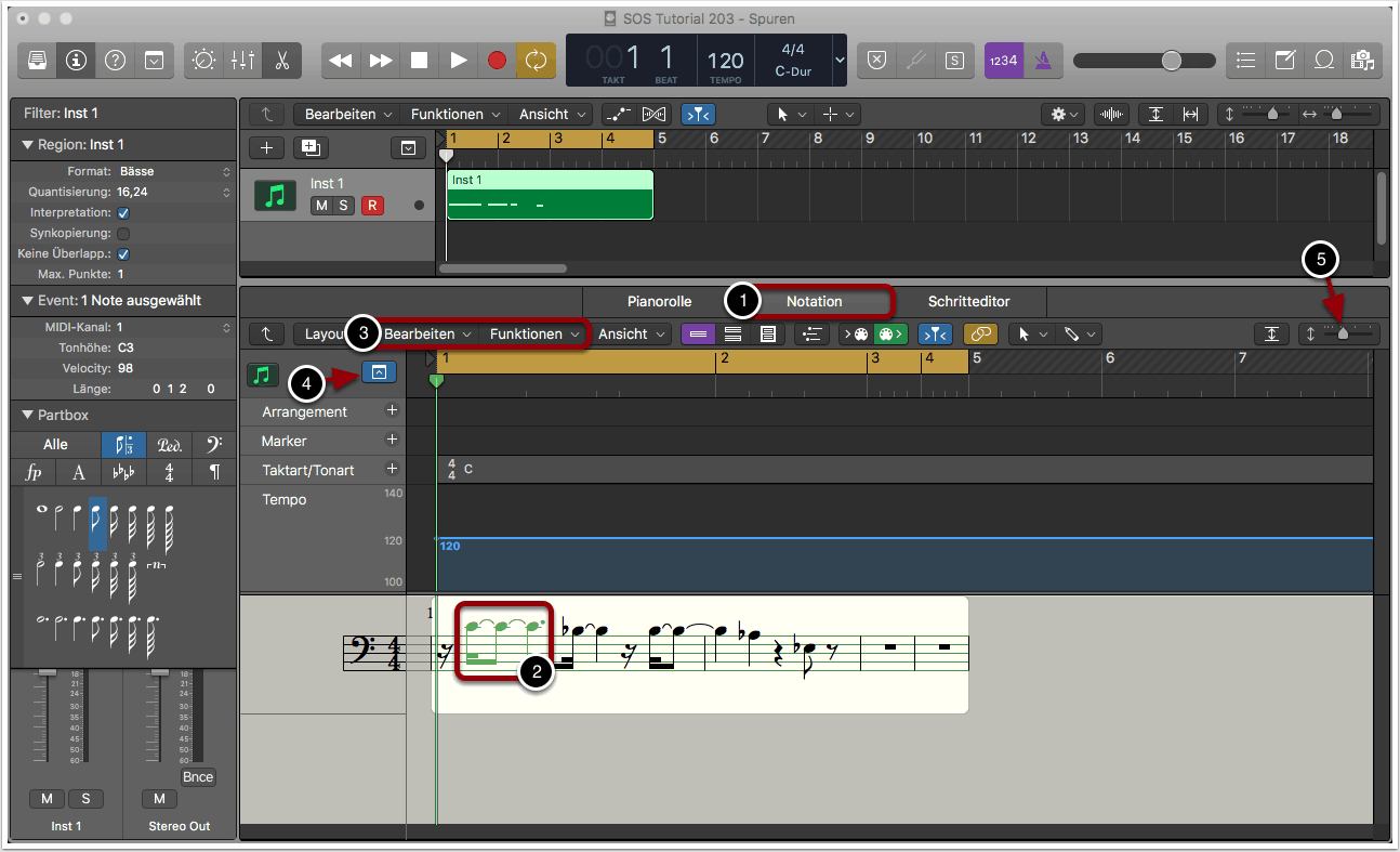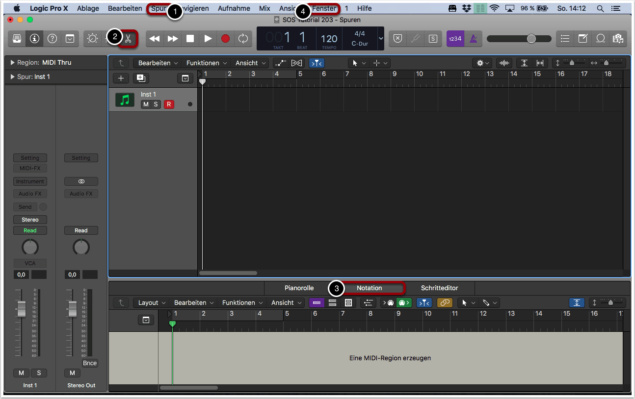 Alternativ kann der Editor über Fenster -> Notationseditor oder durch den Shortcut cmd+5 als externes Fenster aufgerufen werden (4).
