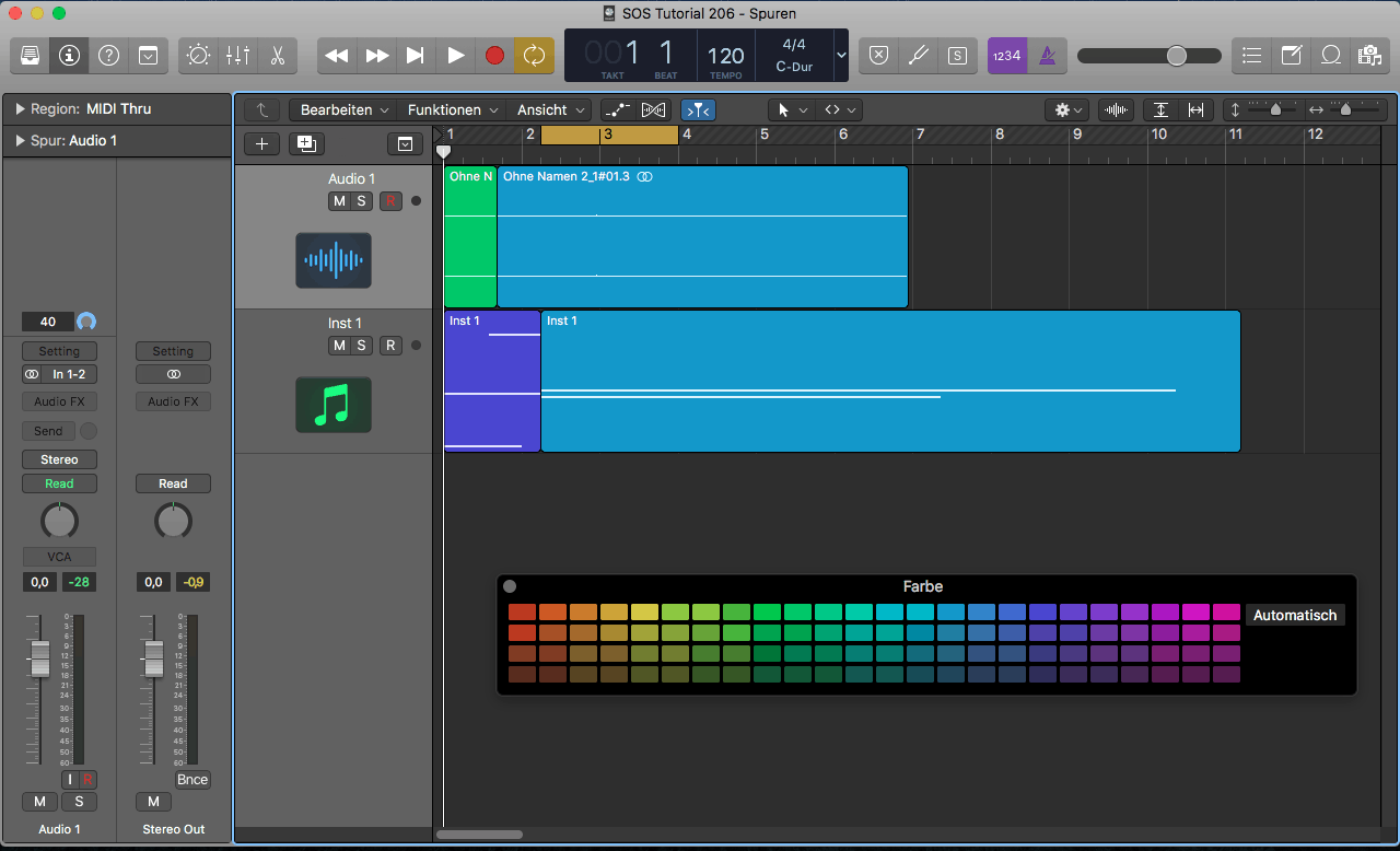 Die farbliche Kennzeichnung von Regionen kann sich sehr positiv auf den Workflow mit Logic Pro X auswirken. Die Farbe von Regionen kann beispielsweise geändert werden, um Abschnitte des Arrangements zu kennzeichnen oder Spurtypen unterscheiden zu können. Neu aufgenommene oder hinzugefügte Regionen übernehmen die Farbe des Spur-Channel-Strips. Sind mehrere Regionen ausgewählt, wirkt sich die Farbanpassung auf alle diese Regionen aus.