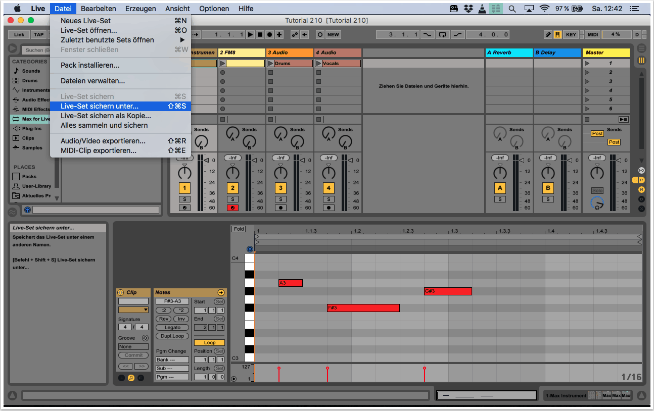 Die Option „Live-Set sichern unter…“ findet ihr im Datei-Menü von Live. Ihr könnt z.B. den Schreibtisch bzw. Desktop als Speicherort wählen.