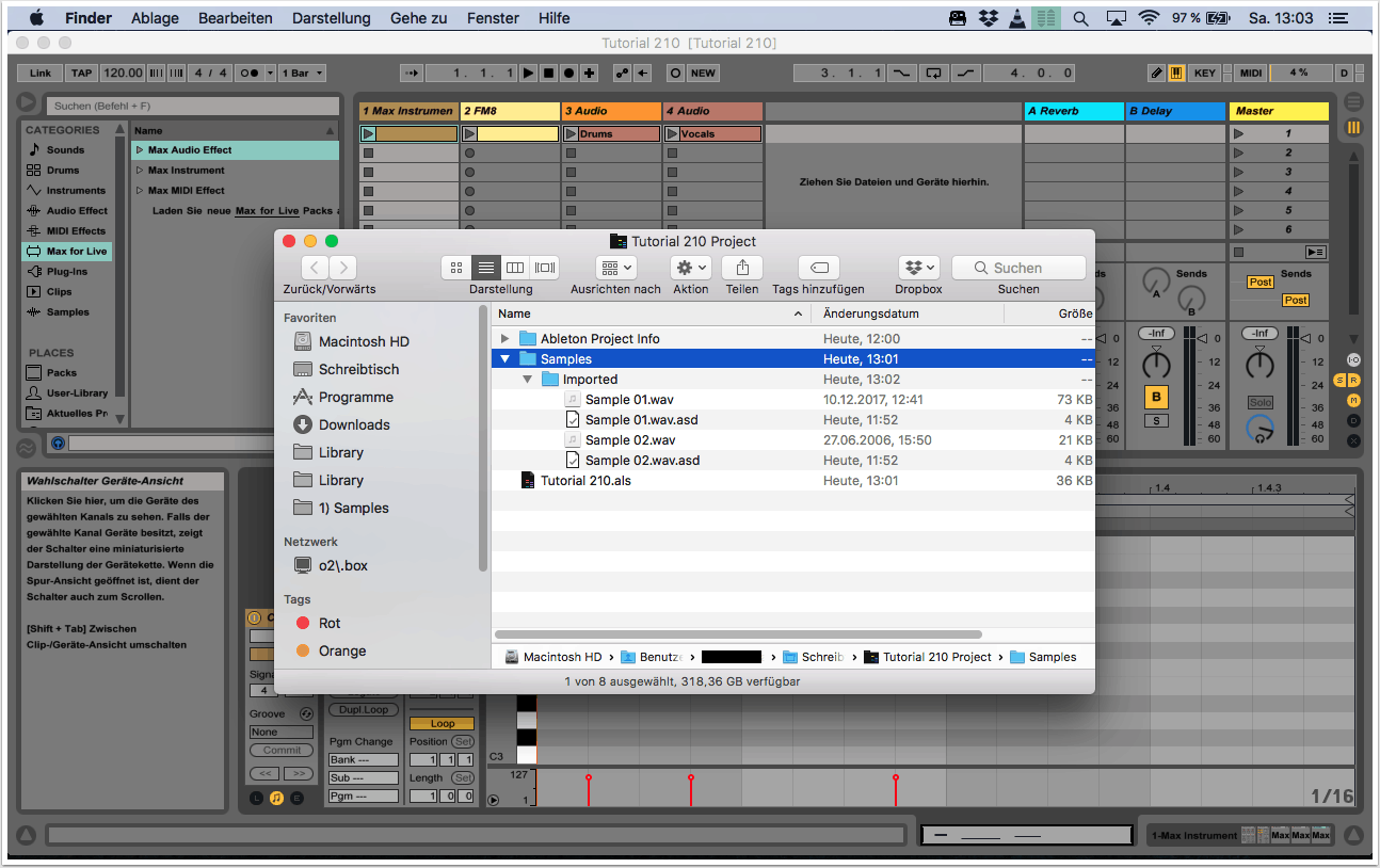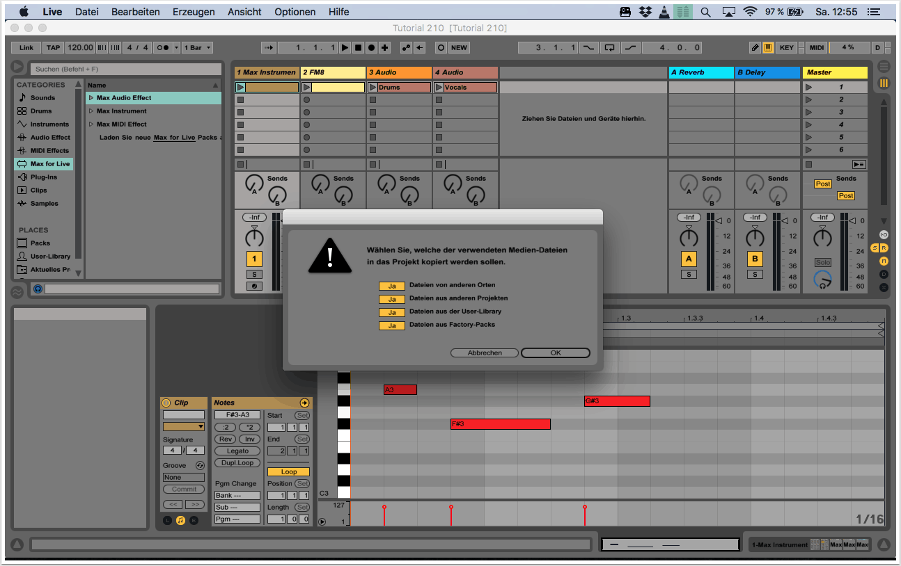 Der Projektordner wird jetzt einen neuen Unterordner mit dem Namen „Samples – Imported“ haben, der alle kopierten Mediendateien enthält. Max-for-Live-Module werden zu einem Unterordner mit dem Namen „Presets“ hinzugefügt.