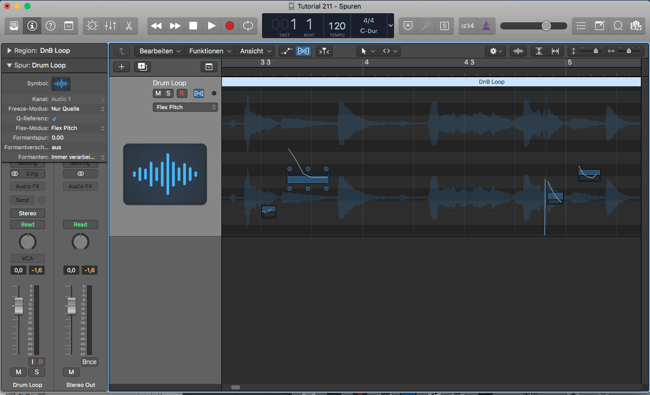Wenn wir etwas näher in die Wellenform herein zoomen, können wir weitere Bearbeitungsmöglichkeiten von Flex Pitch erkennen: Veränderungen der Tonhöhe können auch nur auf Abschnitte innerhalb einer Audioregion vorgenommen werden – z.B. auf einzelne Drum-Hits oder Vocals.
