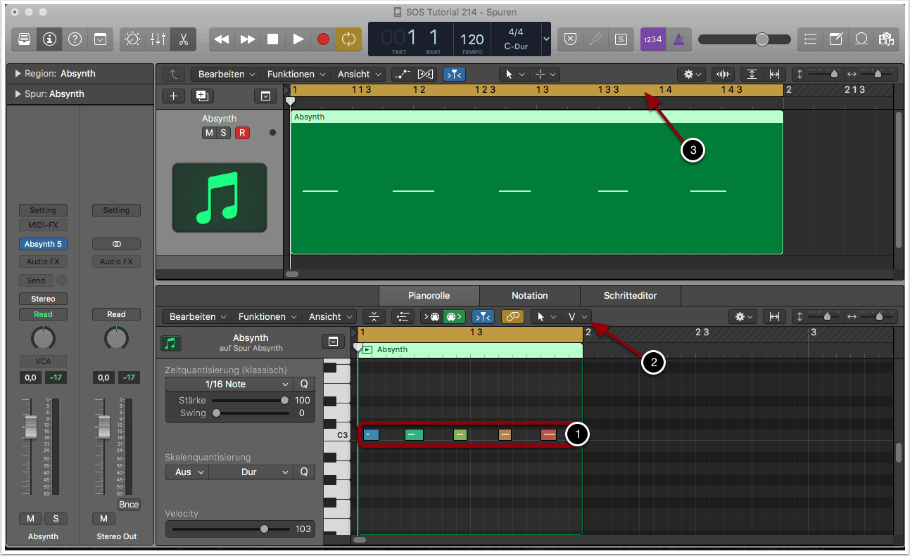 In der Abbildung haben wir eine Note auf MIDI-C3 erstellt und diese mehrmals hintereinander kopiert. Die MIDI-Werte für Velocity steigen dabei von Note zu Note kontinuierlich an (1).