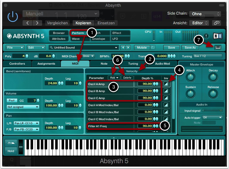 Noch ein kleiner Tipp zum Abschluss: Über das kleine Tastensymbol könnt ihr das virtuelle Keyboard von Absynth ein- und ausblenden. Einen variierenden Tastendruck könnt ihr damit jedoch nicht simulieren (7).