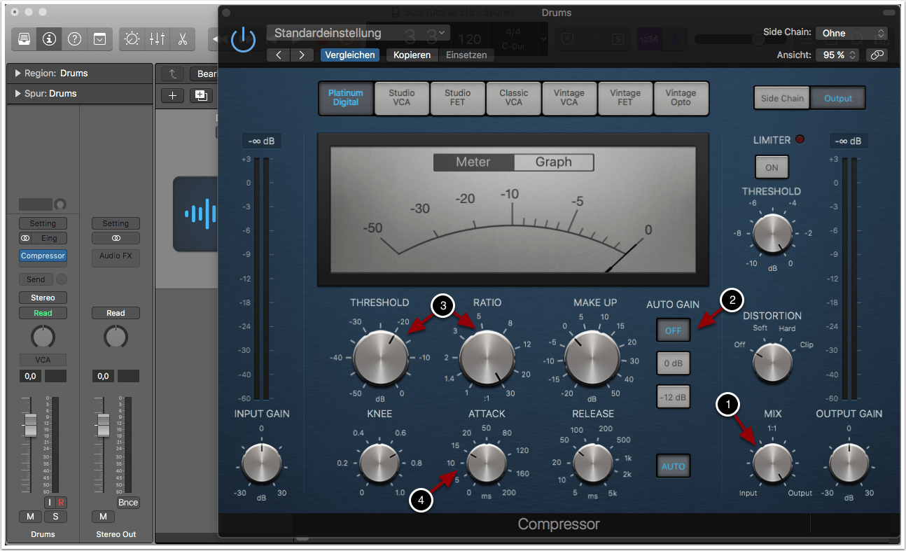 Um die Kompressor-Settings zu bestimmten, drehen wir den Dry-/Wet-Regler des Kompressors zunächst voll auf (1).