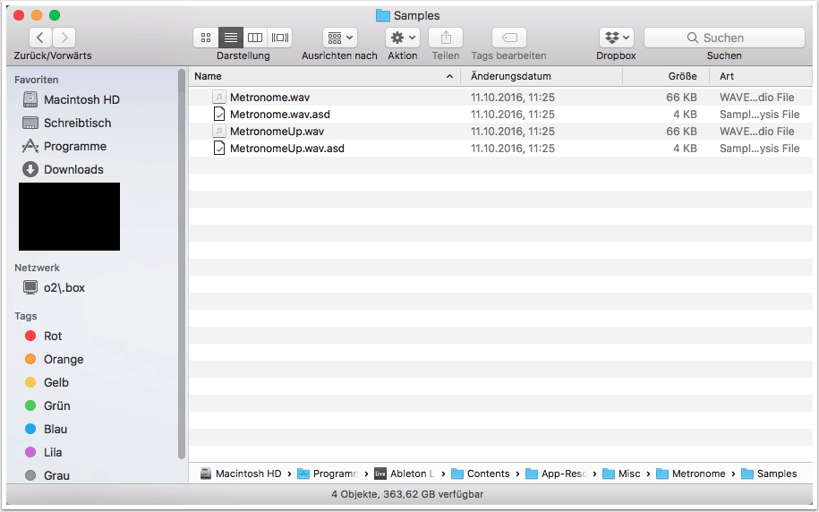 Die beiden Samples sind als Teil der Live-App enthalten. Diese solltest du in deinem Programm-Ordner finden. Mit einem Rechtsklick auf die App findest du die Option „Paketinhalt anzeigen“. Navigiere anschließend zu Contents -> App-Resources -> Misc -> Metronome -> Samples. Der Pfad für Windows lautet: C:\ProgramData\Ableton\ Live 9\Resources\Misc\Metronome\Samples.