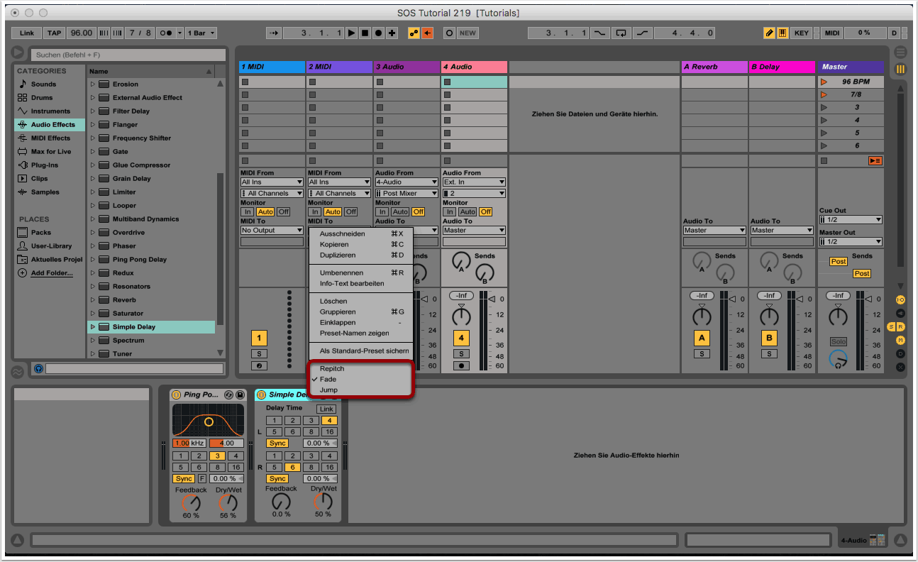 Der Sound und die Funktionsweise der beiden Delay-Effekte von Live – Ping Pong Delay und Simple Delay – sind in ihrem normalen Gebrauch rein „digital“. Mit einem Rechtsklick auf die Titelzeile der Effekte hast du Zugriff auf zwei weitere Delay-Arten: „Repitch“ und „Jump“. Die drei Delay-Modi sind im Ableton Handbuch folgendermaßen beschrieben: