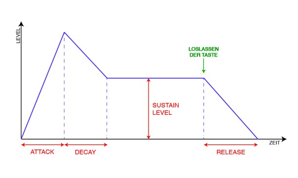 Im Gegensatz zum LFO ist die Klangmodulation nicht zyklisch, d.h. bei ausgehaltener Note wiederholt sie sich nicht. Envelopes werden in der Regel durch vier Zeitintervalle bestimmt, mit vier Ankerpunkten, die über unterschiedliche Parameterwerte verfügen können: Attack-Decay-Sustan-Release (ADSR).