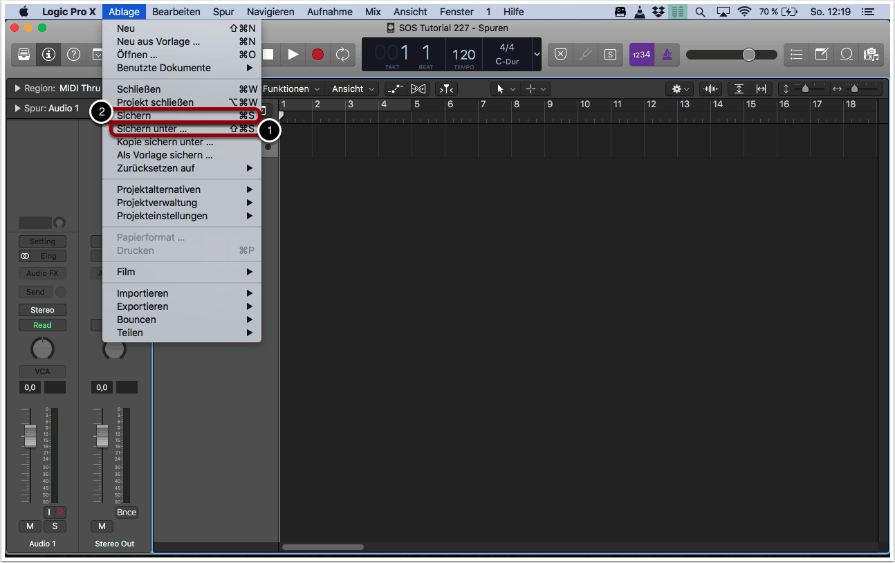 Über „Ablage“ -> „Sichern unter…“ kannst du ein Projekt erstmalig sichern (1).