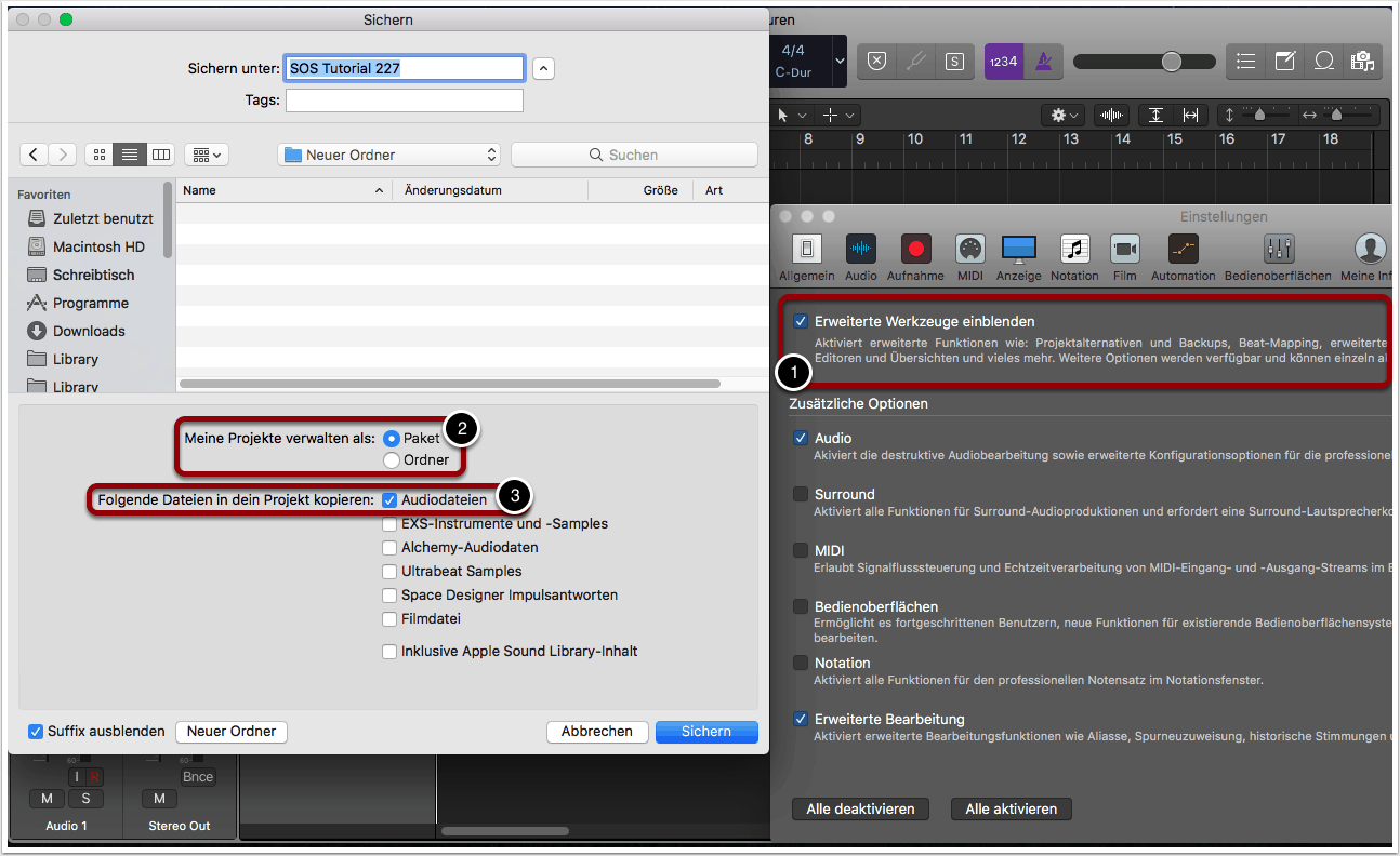 Wenn du eine Logic-Session als Paket sichern willst, musst du zunächst die Option „Erweiterte Werkzeuge einblenden“ aktivieren. Diese findest du in der Rubrik „Erweitert“ in den Haupteinstellungen von Logic Pro X (Logic Pro X -> Einstellungen -> Erweitert) (1).