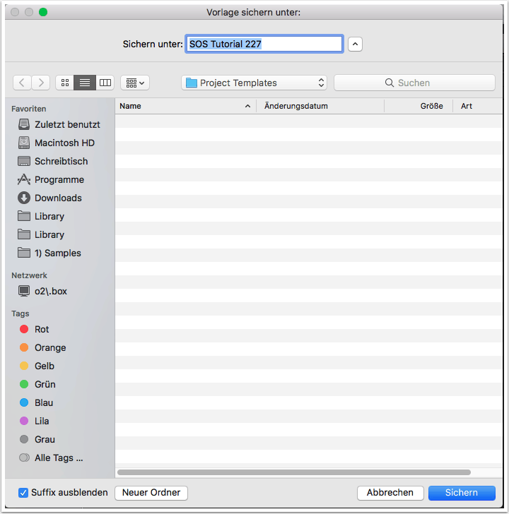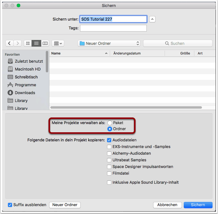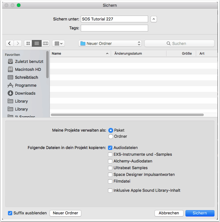 Zum erstmaligen Speichern von Projekten bietet Logic Pro X zwei Möglichkeiten – als Paket oder Projektordner.