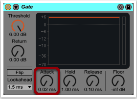 Mit der Attack (gemessen in ms) bestimmst du die Zeit, die das Gate braucht, um sich vollständig zu öffnen, sobald der Threshold überschritten wird. Erhöhe diesen Parameter allmählich, bis sich das Gate sanft öffnet, die Attack deines Signals aber normal und sauber klingt.