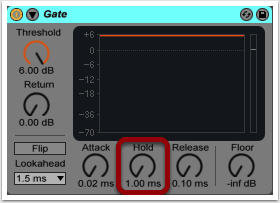 Mit Hold legst du die minimale Zeit fest, die das Gate nach dem Unterschreiten des Thresholds geöffnet bleibt. Bei perkussiven Sounds können hierfür relativ kurze Werte verwendet werden, während bei Basslines, Melodien oder Synth-Pads meistens längere Zeiten angemessen sind.