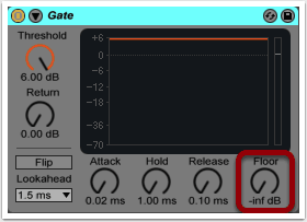 Den Grad der Pegelabsenkung bei geschlossenem Gate legst du mit dem Floor-Parameter fest. Bei einem Wert von -inf wird das Eingangssignal bei geschlossenem Gate komplett unterdrückt. Bei einem Wert von 0dB ist der Gate-Effekt nicht wirksam. Für einen natürlicheren Klangeindruck macht es häufig Sinn, noch einen Hauch der Störsignale in das originale Signal einzuspeisen.