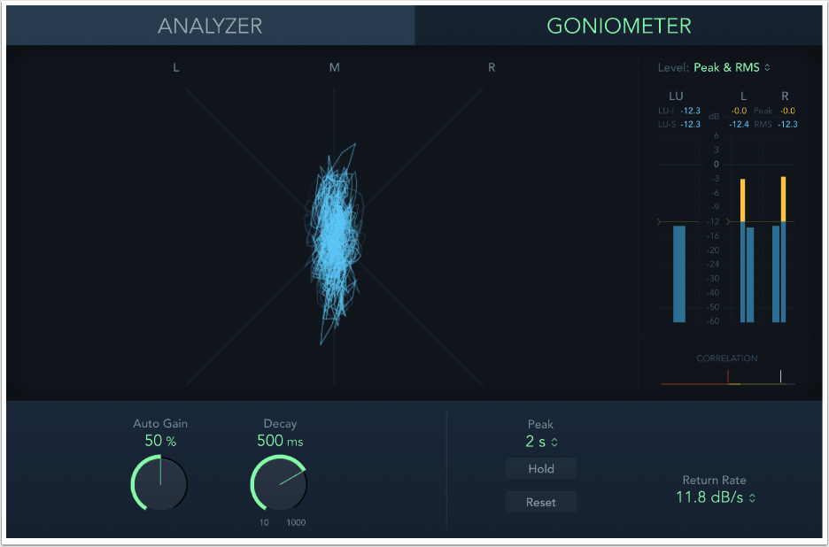Wie du siehst, wird hier zwischen einem Goniometer und einem Korrelationsgradmesser unterschieden. In Fachliteratur, Foren oder bei anderen Programmen werden die beiden Begriffe hingegen oft als Synonyme verwendet. Die Funktionsweise und Anwendung beider Tools sind jedenfalls kaum zu trennen. Der wesentliche Unterschied zwischen Goniometer und Korrelationsgradmesser besteht beim MultiMeter von Logic Pro in einer unterschiedlichen UI. Welches der beiden Werkzeuge sich für eine Analyse von Stereomaterial besser eignet, ist Geschmackssache.