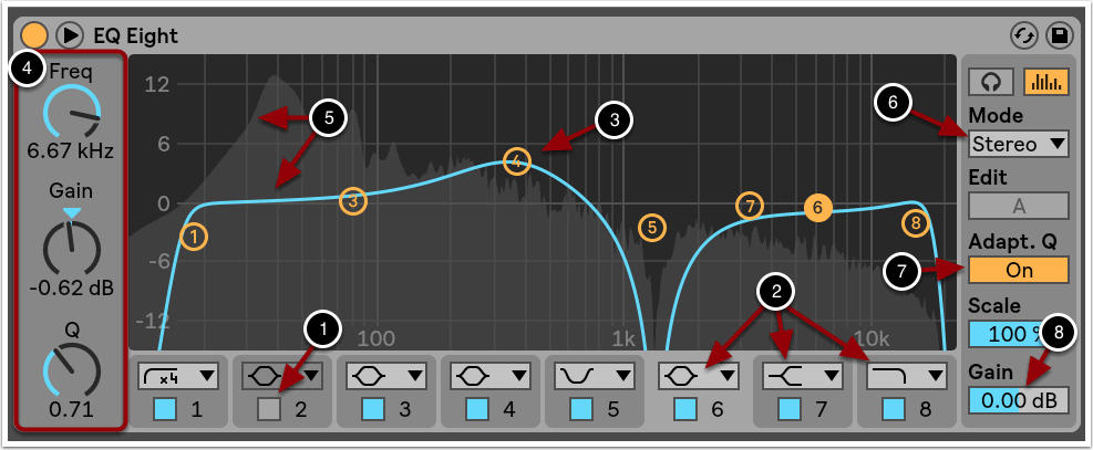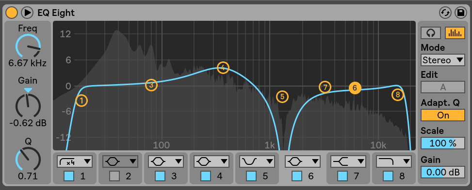 Der EQ Eight ist der mit Abstand komplexeste der drei Live-EQs und verfügt über die meisten Optionen zur Klangsteuerung. Es handelt sich dabei um einen sog. „vollparametrischen Equalizer“. Das bedeutet, dass die verschiedenen Frequenzbänder hinsichtlich Gain, Zielfrequenz und Filtergüte bzw. Bandbreite verändert werden können. Selbst die Filtertypen können pro Band bestimmt werden. Bis zu acht Bänder stehen pro Eingangskanal zur Verfügung.