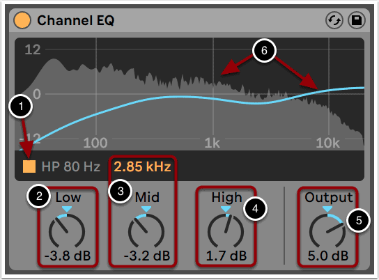 Der Channel EQ basiert auf drei Frequenzbändern, die sich hinsichtlich Zielfrequenz und Gain individuell anpassen lassen. Inspiriert wurde der EQ laut Ableton von der Klangregelung klassischer Analog-Konsolen.