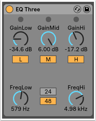 Der EQ Three verfügt im Vergleich zu den anderen Equalizern von Live über die wenigsten Klangparameter, ist jedoch auch am einfachsten in der Handhabung. Der Equalizer verfügt über drei Frequenzbänder, die zur Einstellung der Lautstärken für Bässe, Mitten und Höhen verwendet werden können.