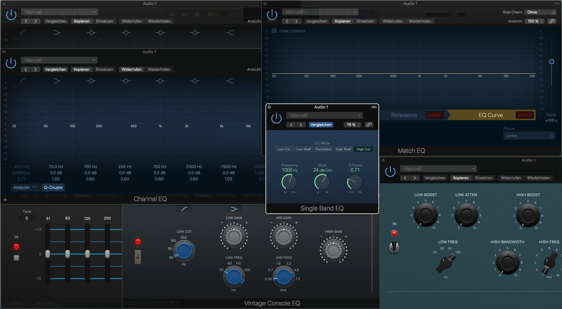 Equalizer gehören ohne Frage zu den wichtigsten Audio-Tools eines Tonstudios. Von der Bearbeitung einzelner Drum-Sounds bis hin zum Mastering kommen EQs in allen Bereichen einer Musikproduktion vor. In Logic Pro X stehen hierfür sieben Equalizer zur Verfügung, die sich hinsichtlich Klangcharakter, Handhabung und Funktionsumfang unterscheiden: Channel EQ, Linear Phase EQ, Match EQ, Single Band EQ und die drei Vintage-EQs Vintage Console EQ, Vintage Graphic EQ und Vintage Tube EQ.