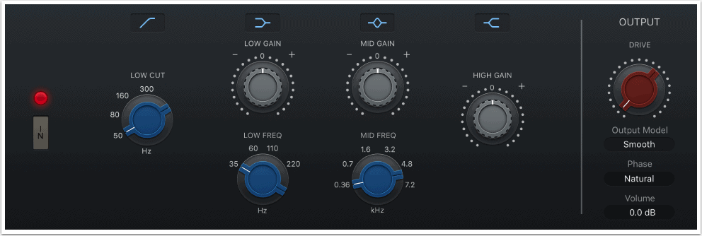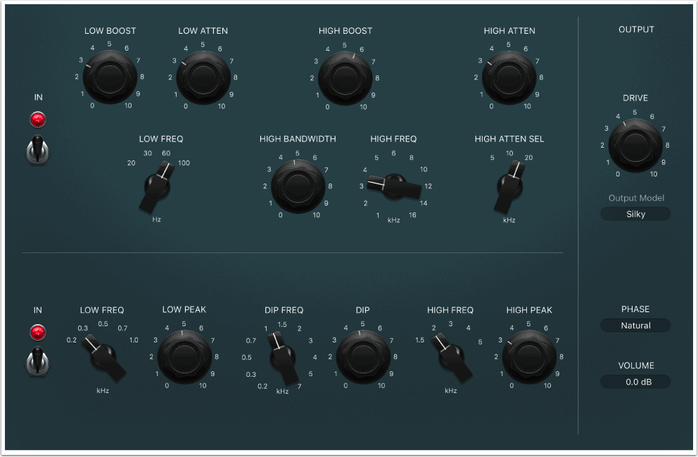 Alle drei Vintage-EQ-Plug-ins sind mit den gleichen primären Bedienelementen ausgestattet. Allerdings bietet jeder der drei Vintage-EQs noch eine Reihe an zusätzlichen eigenen EQ-Reglern.