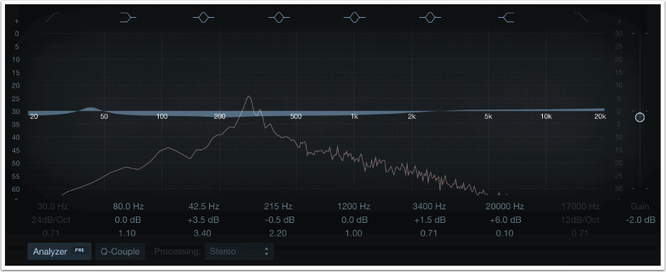 Außerdem verfügt der Channel EQ über einen FFT-Analyzer (Fast-Fourier-Transformation), der die Veränderungen im Frequenzspektrum in Echtzeit grafisch darstellt.
