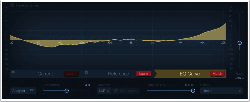 Mit dem Match EQ kannst du das Frequenzspektrum eines Input-Signals analysieren, als akustischen „Fingerabdruck“ speichern, und anschließend auf ein anderes Audiosignal anwenden. Dieser Vorgang wird auch als „Fingerprint EQ-ing“ bezeichnet. Das Spektrum des Quellsignals wird dabei mit dem Frequenzgang des aktuellen Signals verglichen. Basierend auf dem Unterschied beider Spektren wird dann eine Filterkurve erstellt, die den Klang des neuen Signals der Vorlage angleicht.